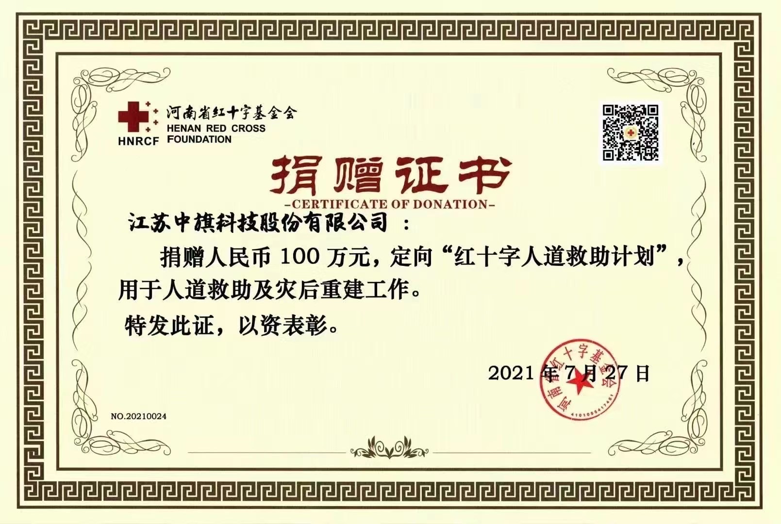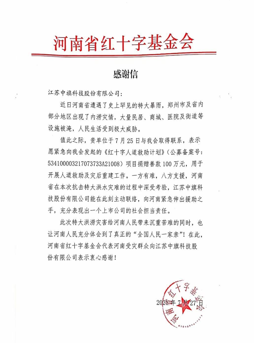 2021年7月河南遭遇了罕見的暴雨洪災(zāi),牽動著全國人民的心。中旗科技心系災(zāi)區(qū),經(jīng)董事會決議通過向河南省紅十字基金會捐贈100萬元,定向“紅十字人道救助計劃”,用于河南省人道救助及災(zāi)后重建工作。
